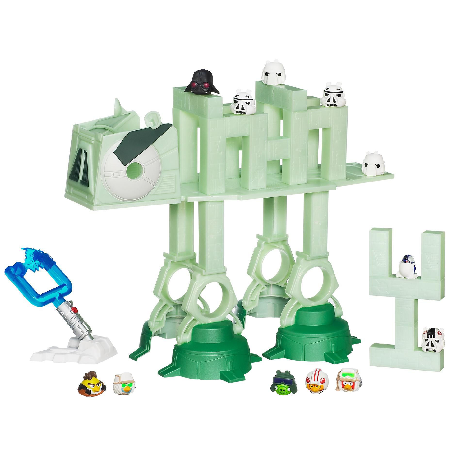HASBRO ANGRY BIRDS STAR WARS AT-AT Attack Battle Game The ANGRY BIRDS STAR WARS app comes to life! This line of Hasbro toys captures all the launching and destroying fun of the app in physical form and features your favorite STAR WARS characters re-imagined as high-flying ANGRY BIRDS and villainous pigs! Stack, launch, and destroy with the AT-AT Attack Battle Game, which includes 21 blocks to create the massive, signature AT-AT, a LIGHTSABER launcher and 12 ANGRY BIRDS STAR WARS figures - including two that are exclusive to this set! Players can also unlock ANGRY BIRDS STAR WARS in-app content with a special code in each pack.AT-AT Attack Battle Game brings the ANGRY BIRDS STAR WARS app to life! The battle game captures all the launching and destroying fun of the app! Featuring your favorite STAR WARS characters re-imagined as high-flying ANGRY BIRDS and villainous pigs.Includes LUKE SKYWALKER (HOTH Pilot) , LUKE SKYWALKER (ECHO BASE Gear) , HAN SOLO and Rebel Trooper (ECHO BASE Gear) bird figures! Also includes DARTH VADER, AT-AT Driver, AT-AT Commander, 2 SNOWTROOPER and 2 STORMTROOPER pig figures! Includes R2-D2 egg figure! LUKE SKYWALKER (ECHO BASE Gear) bird figure and AT-AT COMMANDER pig figure are only available in this set! Includes 8 pieces and 21 blocks to build an AT-AT.Fire the ANGRY BIRDS at the AT-AT to knock it down! Set includes 12 figures, 21 blocks, 8 AT-AT pieces, 1 LIGHTSABER launcher and instructions.Ages 5 and up.Adult assembly required.WARNING: CHOKING HAZARD Toy contains small parts and small balls. Not for children under 3 years.CAUTION: Do not aim at eyes or face. TO AVOID INJURY: Use only figures designed for this product. Do not modify figures or figure launcher..