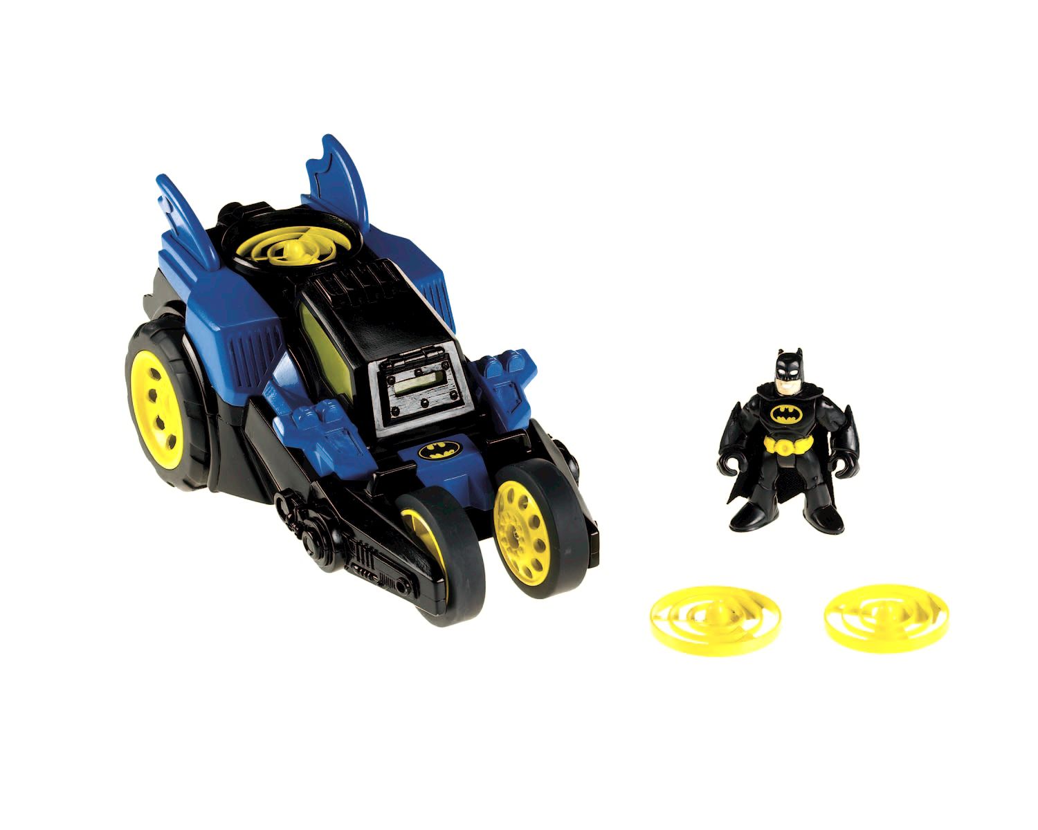 Imaginext Motorized Batmobile Motorized Batmobile Lets You Imagine a World of Action and Excitement Tiny hands will have no trouble manipulating the Imaginext Motorized Batmobile. Your little one will seat Batman behind the wheel of the Batmobile, and off they go as fast as your child's imagination can travel! Press the button for wheel-spinning action and cool sounds. After the Batmobile travels three feet it launches its bright yellows spy drone so your young Super Hero can save Gotham City from its evil enemies. Colorful and durable, Motorized Batmobile will hold your child's interest for hours and hours of Super Hero adventure and role play. Imaginext toys are designed to stimulate young imaginations and creative role play. As children fit Batman into his Batmobile, load the disc launcher and press the button to send the vehicle roaring off, they will sharpen fine motor skills along with imaginations. Perfect for children age three to eight years..